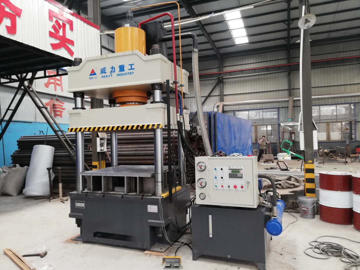 【產(chǎn)品描述】:本液壓機(jī)用于不銹鋼餐盤的壓制成型,把不銹鋼板材放置在液壓機(jī)餐盤模具上,液壓機(jī)運(yùn)動(dòng)上下壓制,液壓機(jī)下壓保壓后,餐盤壓制成型,還可以用于不銹鋼水槽、不銹鋼盆、不銹鋼鍋的成型以及其他不銹鋼產(chǎn)品的壓制成型。山東威力重工機(jī)床有限公司可根據(jù)模具、拉伸變形量、不銹鋼板厚度,推薦選用200噸、315噸、400噸、500噸的四柱液壓機(jī)來(lái)完成一次拉伸成型工藝,可根據(jù)客戶
